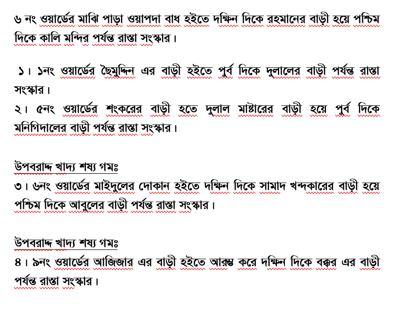 | নং | শিরোনাম | কাজের বর্ননা | ফাইল সমূহ | বরাদ্দের পরিমাণ (টাকায়) | বরাদ্দের পরিমাণ (অন্যান্য) | প্রকল্প শুরু | প্রকল্প শেষ | ওয়ার্ড | সর্বশেষ হালনাগাদের তারিখ | অগ্রগতির হার | কার্যকলাপ |